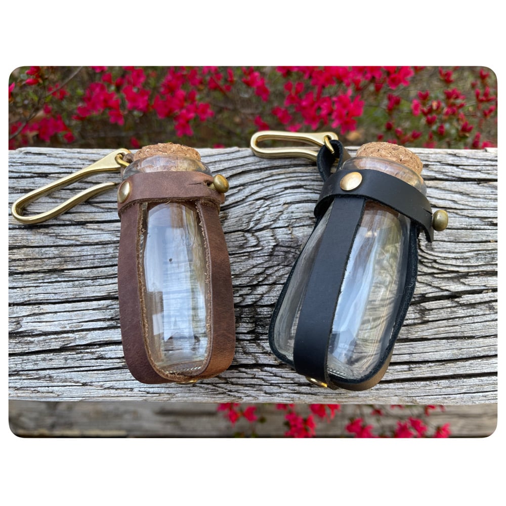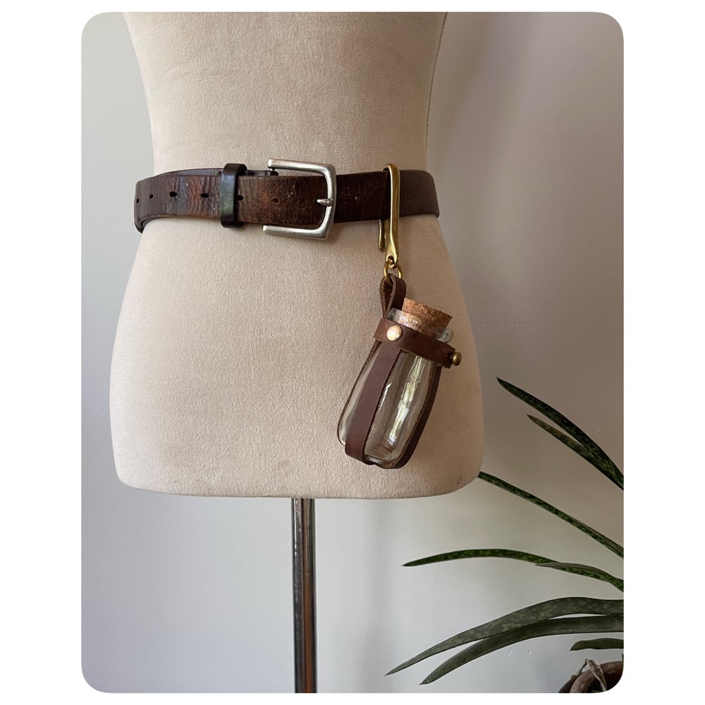 Cork topped leather wrapped 100ml bottle with brass hardware and j-hook for easy attachment to any belt.