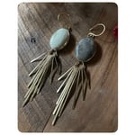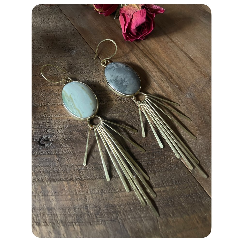 Mismatched Green and Grey Agate Solid Brass Fringe Earrings