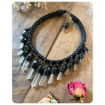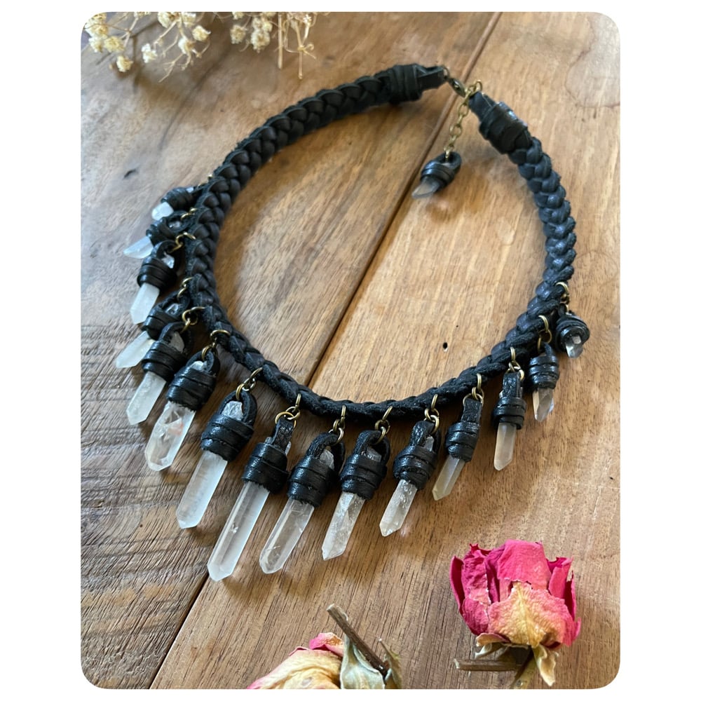 The Empress Necklace - Clear Quartz Crystals and Black Leather