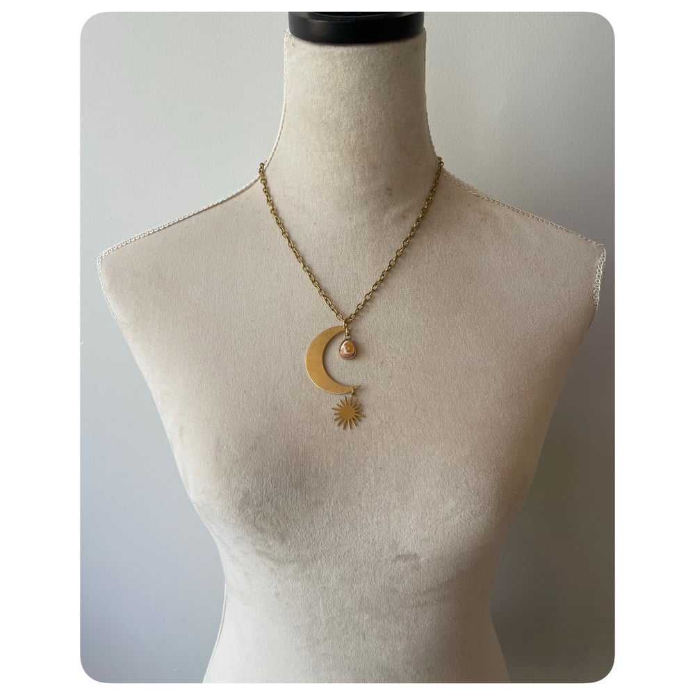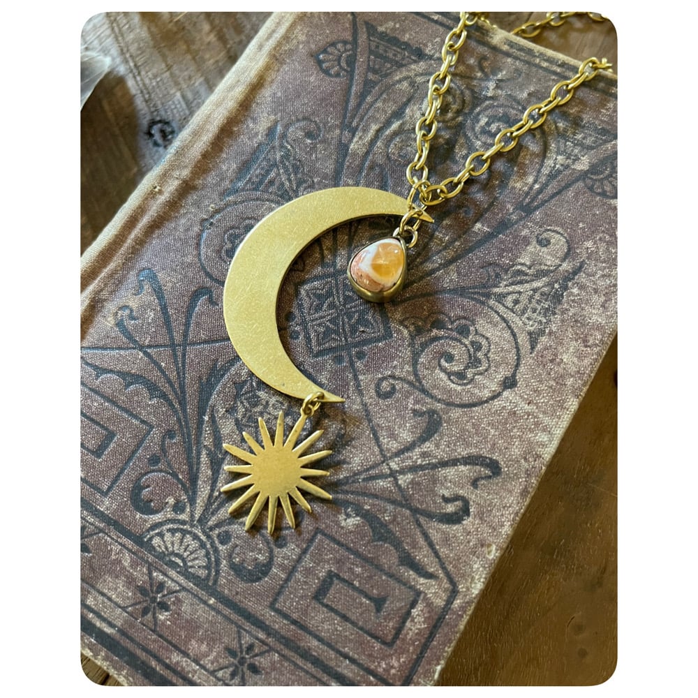 Solid Brass Moon Pendant Necklace - Large Sun and Fiery Mexican Opal