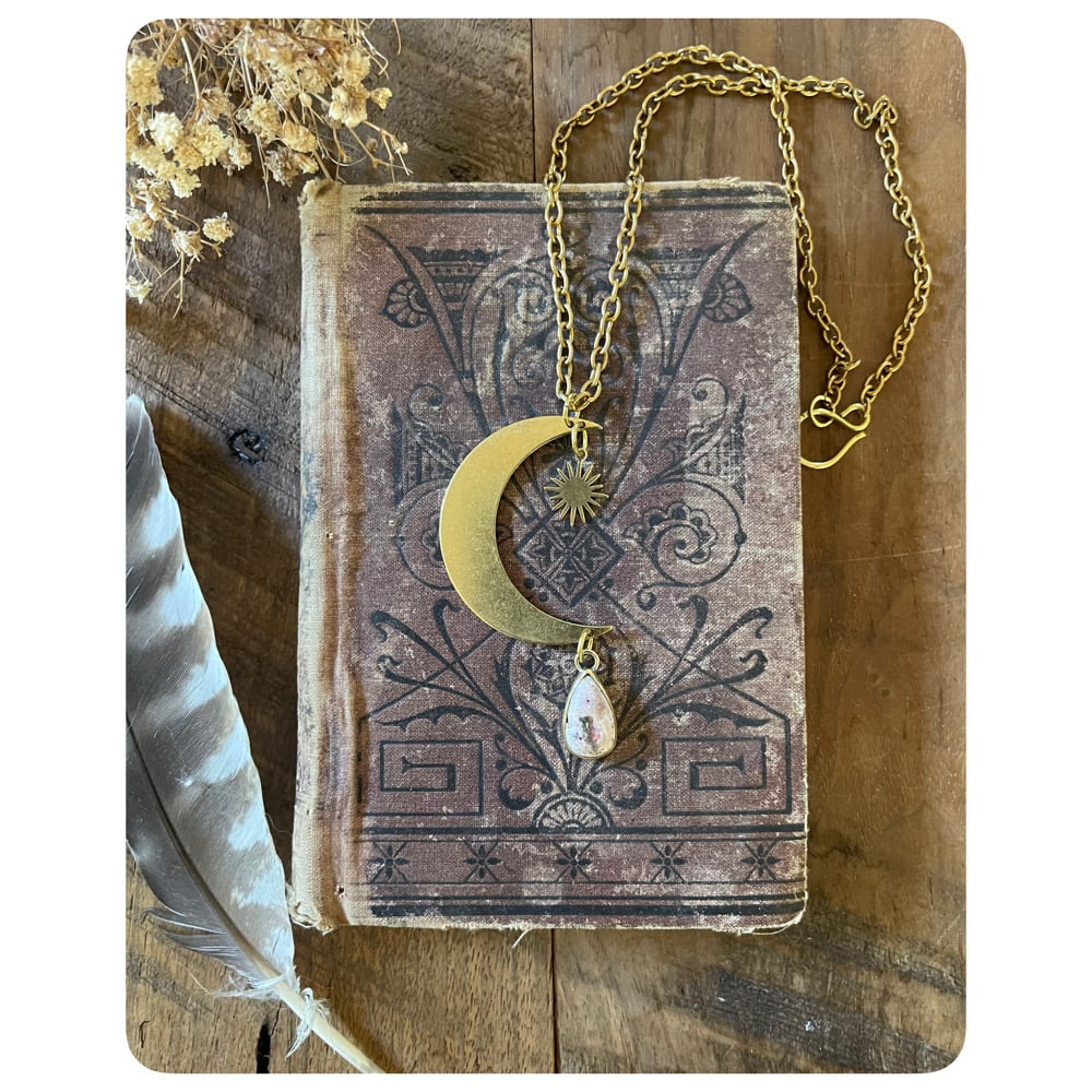 Solid Brass Moon Pendant Necklace - Mini Sun and Mexican Opal