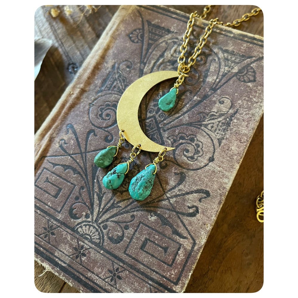 Solid Brass Moon Pendant Necklace - Turquoise Teardrops