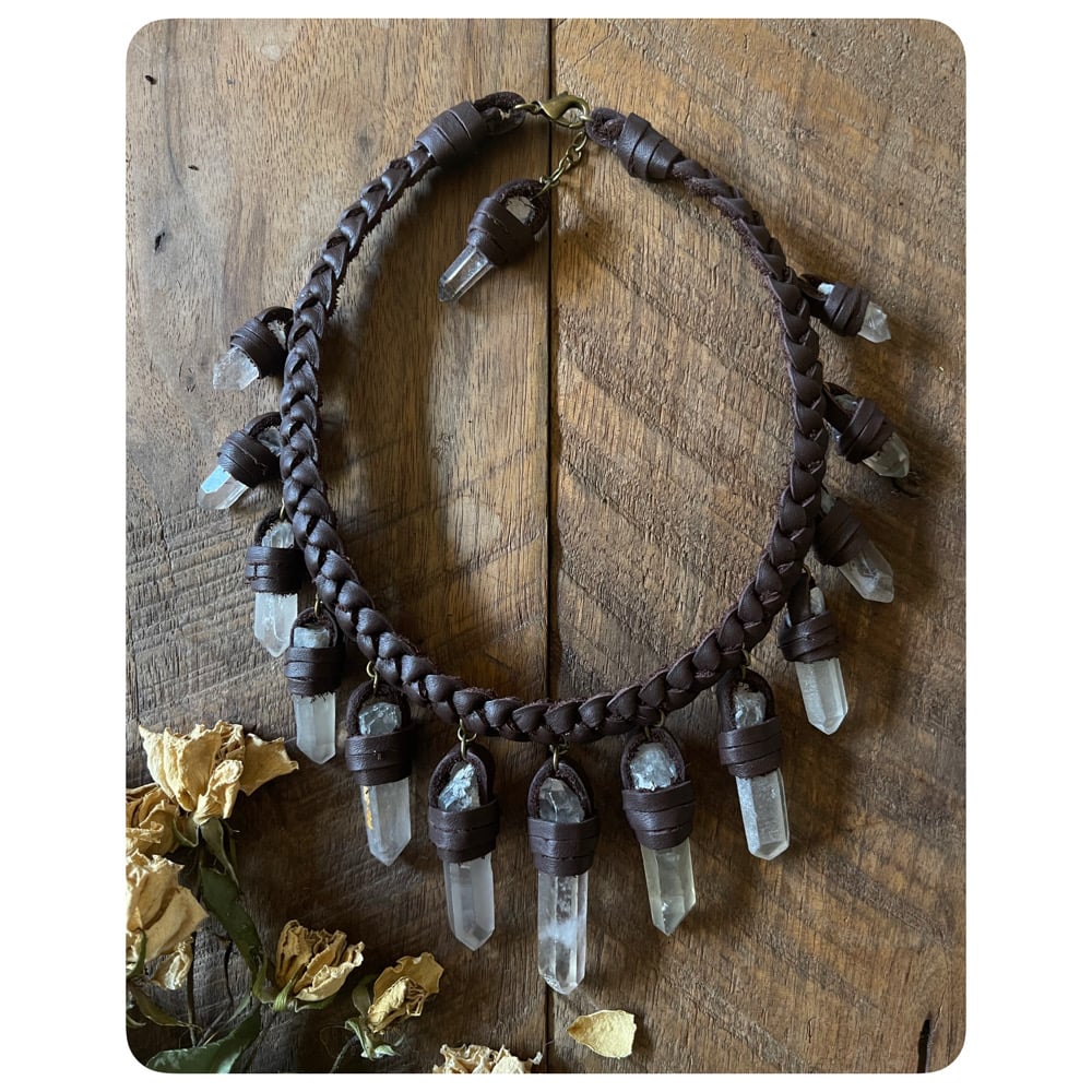 The Empress Necklace and Earrings - Clear Quartz Crystals and Dark Brown Leather