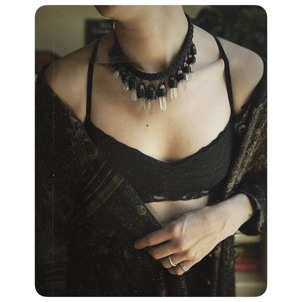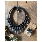 The Empress Necklace and Earrings - Clear Quartz Crystals and Black Leather