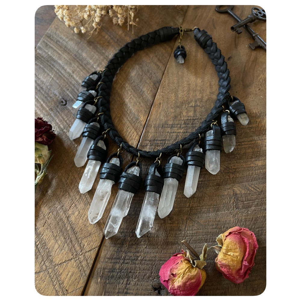 The Empress Necklace - Clear Quartz Crystals and Black Leather