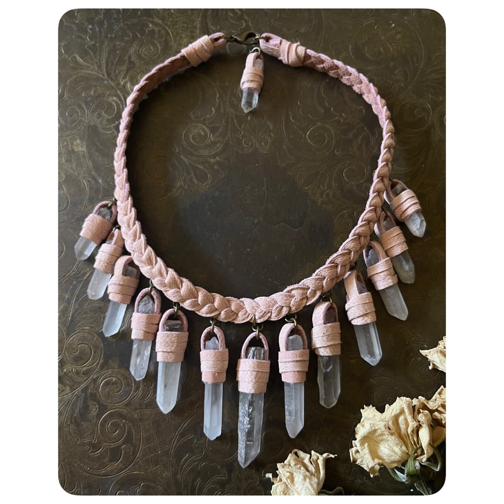 The Empress Necklace - Clear Quartz Crystals and Soft Petal Pink Leather