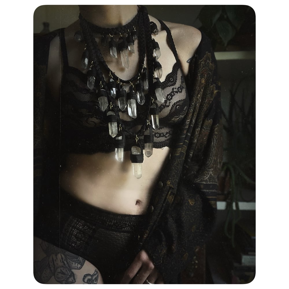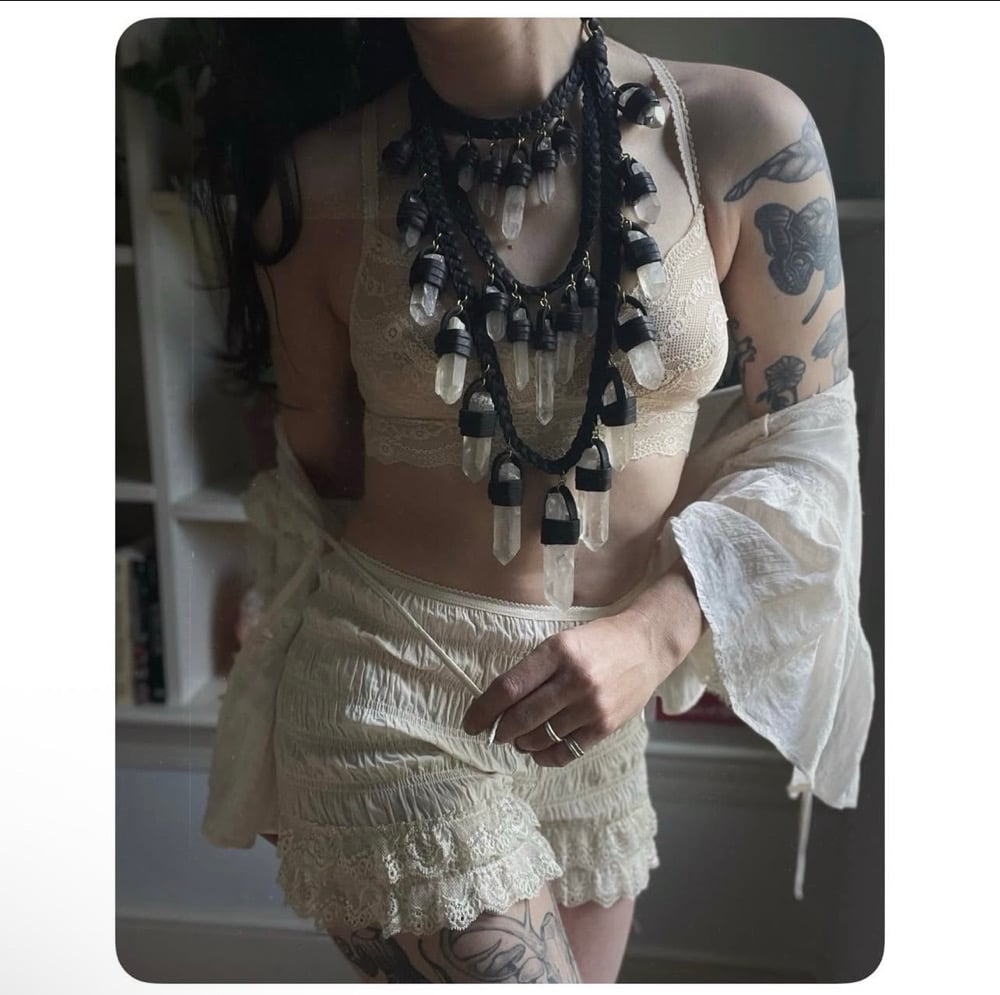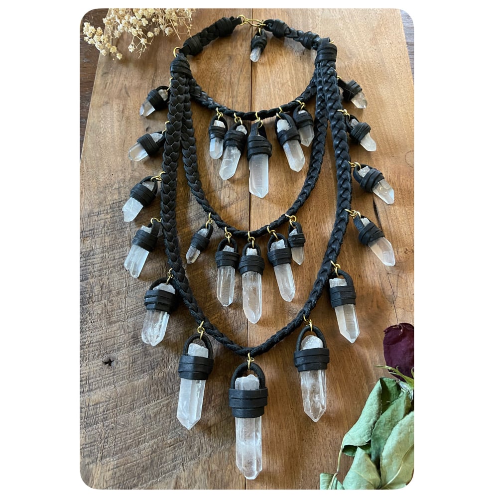 The Venus Necklace XL - Clear Quartz Crystals and Black Leather