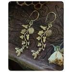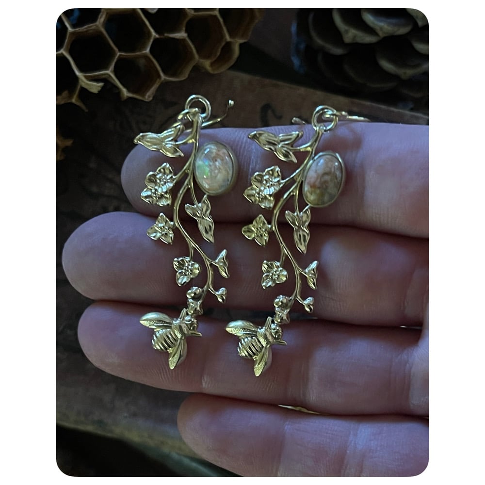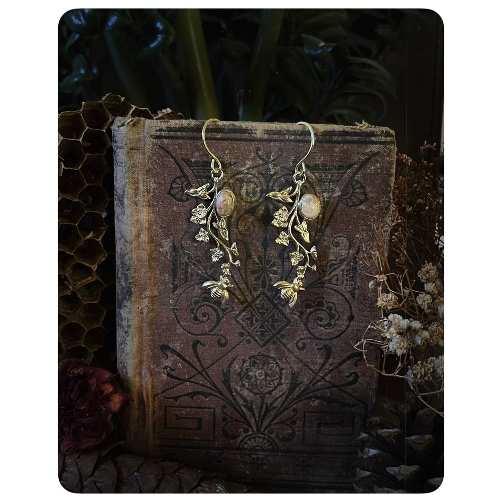 Victorian Floral Spray Honey Bee and Mexican Opal Solid Brass Earrings